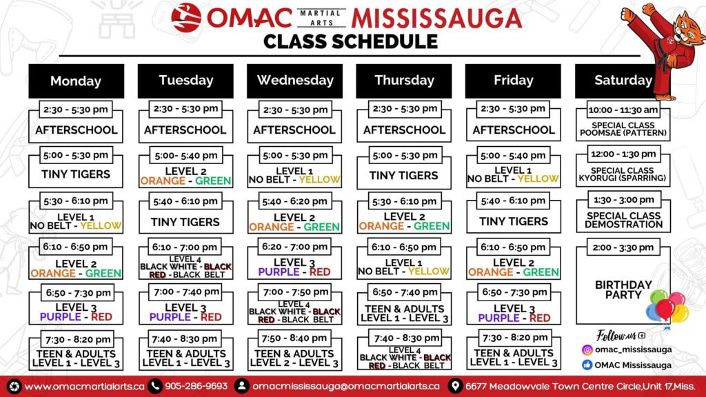 Welcome to OMAC Martial Arts in Mississauga, your gateway to elite martial arts training in the vibrant Peel Region. Under the expert guidance of our esteemed Head Master, Nam, OMAC Martial Arts is dedicated to providing a world-class martial arts experience. With a commitment to excellence that spans decades, our instructors bring a wealth of knowledge and expertise to the mat, ensuring that each student receives top-tier instruction.But that’s not all. OMAC Martial Arts in Mississauga is more than just a place to master martial arts. We are proud to introduce our enriching afterschool program that complements our martial arts curriculum. Whether you’re interested in mastering Taekwondo, enhancing your self-defense skills, or seeking a path to personal growth and fitness, OMAC Martial Arts in Mississauga has the program for you. Join us on this exciting journey to discover the benefits of martial arts, from building confidence to fostering discipline. Experience the OMAC difference today and unlock your full potential, both on and off the mat. Your martial arts journey and personal development begin here, at OMAC Martial Arts in Mississauga, where tradition meets modern excellence.