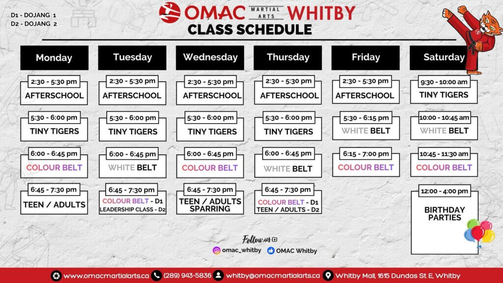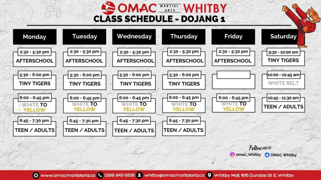 Whether you’re looking to build confidence, strength, and focus, improve fitness, or learn self-defense, OMAC Whitby provides a supportive and disciplined environment for all ages and skill levels. Stay tuned for grand opening details, exclusive promotions, and early registration offers—your martial arts journey starts here!